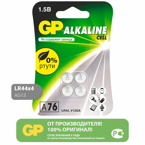 Батарейка GP Alkaline Cell A76 LR44, в упаковке: 4 шт.