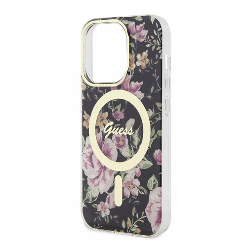 Guess для iPhone 15 Pro чехол PC/TPU Flower Hard Black/Gold (MagSafe)