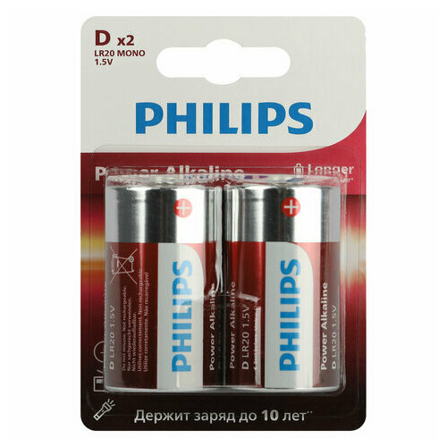 Батарейки алкалиновые комплект 2 шт PHILIPS Power Alkaline, D (LR20, 13А) блистер, Б0062732