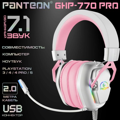 Игровые наушники с микрофоном для ПК с объемным звучанием SURROUND SOUND 7.1 PANTEON GHP-770 PRO белый-розовый (звуковая схема Virtual Surround Sound 7.1+ ПУ на шнуре, USB)