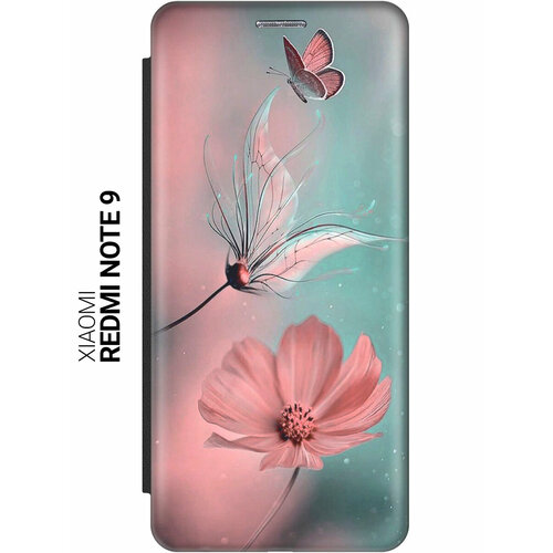Чехол-книжка на Xiaomi Redmi Note 9 с принтом "Бабочка и цветы" черный