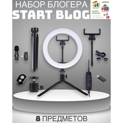 Подарочный набор юного начинающего блогера с кольцевой лампой и микрофоном для творчества Start 8 в 1