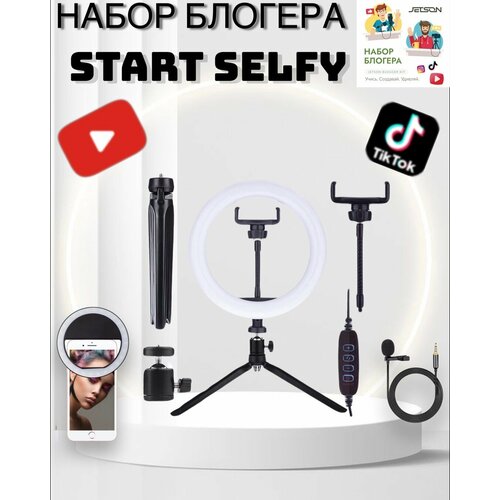 Подарочный набор юного начинающего блогера с кольцевой лампой и микрофоном для творчества Start Selfy 4 в 1