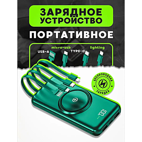 Внешний аккумулятор повербанк с беспроводной зарядкой 4 встроенных кабеля Power Bank 30000 mAh, зеленый