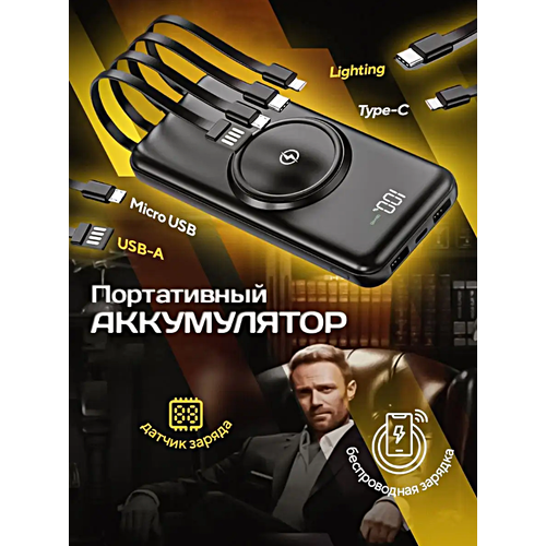 Внешний аккумулятор 30000mAh со встроенными кабелями / повербанк для смартфонов с беспроводной зарядкой Power Bank
