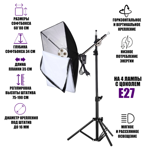 Светоотражающий софтбокс SFJBH35-6088 размер 60х88 см с держателем на 4 лампочки на штативе JBH с журавлём ES-35 с крючком противовеса, без лампочек