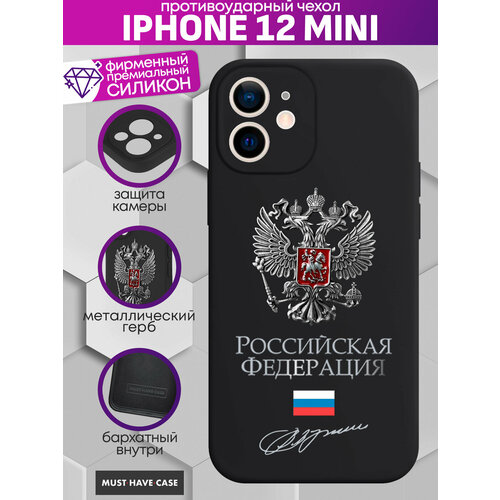 Чехол на iPhone 12 Mini Премиум с Серебристым металлическим Гербом России