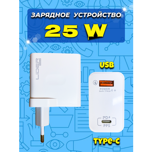 Сетевое зарядное устройство LIDER 25 W Type-A + Type-C 6A/Быстрая зарядка 25 Вт/Блок питания 25 Вт CHARGING EXPRESS QC 4.0