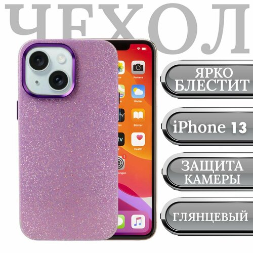 Чехол для iPhone 13 блестящий на Айфон 13 силиконовый с защита камеры и экрана, сиреневый