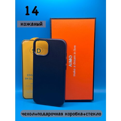 Комплект для iPhone 14 : кожаный чехол с MagSafe и анимацией + защитное стекло 9D (полная защита)