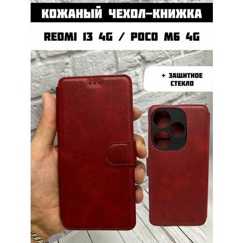 Кожаный чехол-книжка для Redmi 13 4G и Poco M6 4G из Эко кожи Красный