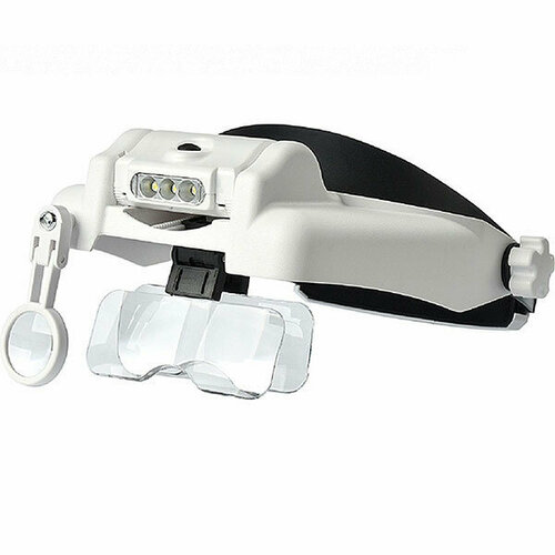 Лупа налобная со сменными стеклами-насадками и удобным фиксатором-обручем на голове.