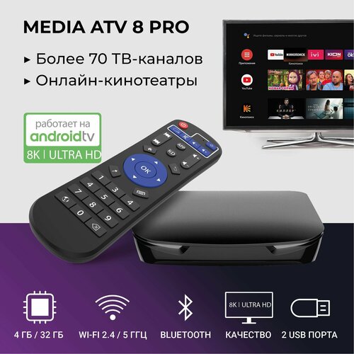 Смарт тв приставка для цифрового ТВ HIPER MEDIA ATV 8K PRO 4/32 Гб, Dual Wi-Fi 2.4 / 5 ГГц, Ultra HD 8K