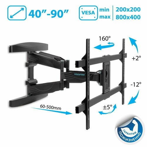 Kromax OMEGA-15 black поддерживает стандарты крепления VESA от 200x200 мм до 600x400 мм, что позволяет использовать ее с большинством современных телевизоров.