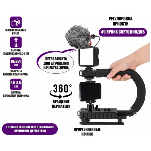 Ручной стабилизатор для камеры, ручка-держатель с зажимом для телефона, осветителем на батарейках и микрофоном пушкой