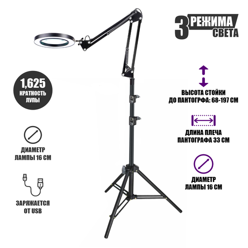 Особенности:- Кратность лупы 1,625х;- 3 цветовых режима;- Возможность вращения лампы на 360 градусов;- Угол наклона стойки до 180 градусов;- Регулировка яркости