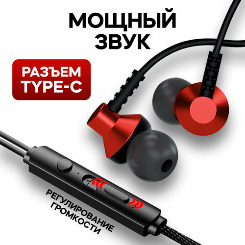 Наушники проводные с микрофоном и кнопкой ответа, WALКЕR, H735, разъем TYPE-C, вкладыши, как jbl, на андроид, xiaomi, самсунг, sony, красные