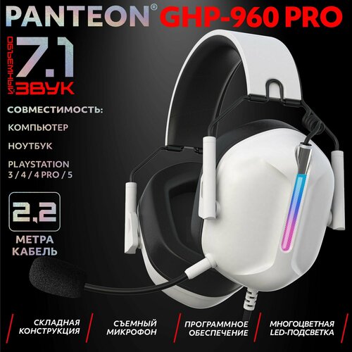 PANTEON GHP-960 PRO White Игровые наушники (USB-подключение, LED-подсветка, VIRTUAL SURROUND SOUND 7.1, складная конструкция, съемный микрофон, фирменное ПО), цвет: белый