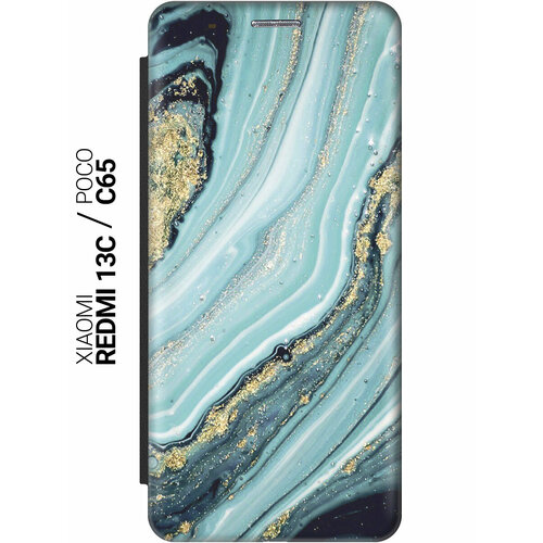 Чехол-книжка на Xiaomi Redmi 13C / Poco C65 / Сяоми Редми 13С / Поко С65 с рисунком "Зеленый мрамор" черный