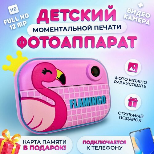Детский цифровой фотоаппарат/видиокамера с wifi, принтер моментальной печати на термобумаге, microSD/Адаптер 32 Gb в комплекте, фламинго