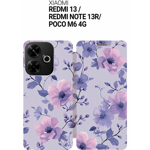 Чехол-книжка на Xiaomi Redmi 13 / Redmi Note 13R / Poco M6 4g с принтом "Цветочки на сиреневом" золотой