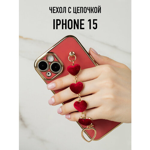 Глянцевый силиконовый чехол на iPhone 15 с цепочкой из сердечек