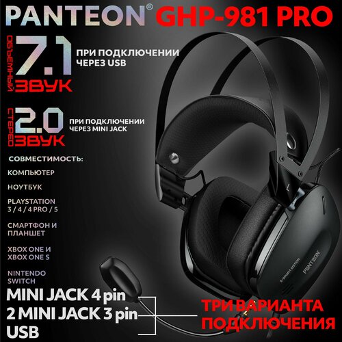 PANTEON GHP-981 PRO Black Игровые наушники (Подключение: MINI JACK 4 PIN / 2 MINI JACK 3 PIN / USB, STEREO SOUND 2.0/ VIRTUAL SURROUND SOUND 7.1, съемный микрофон, фирменное ПО)