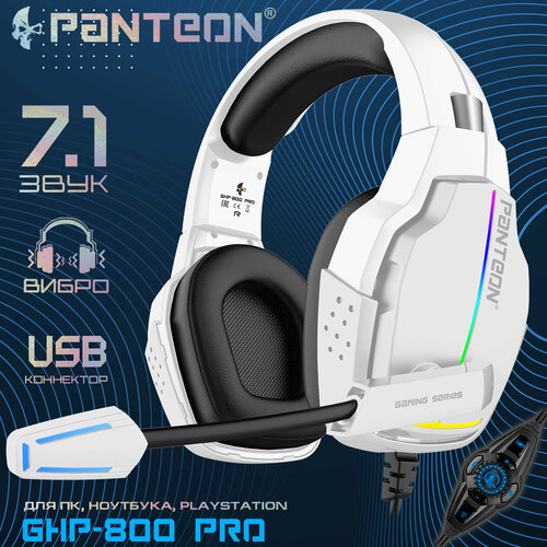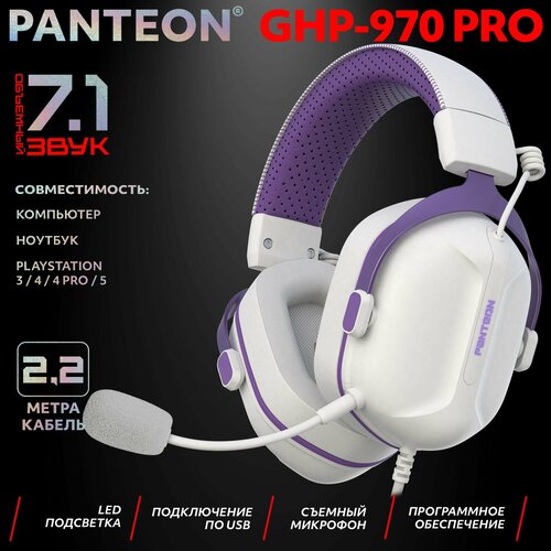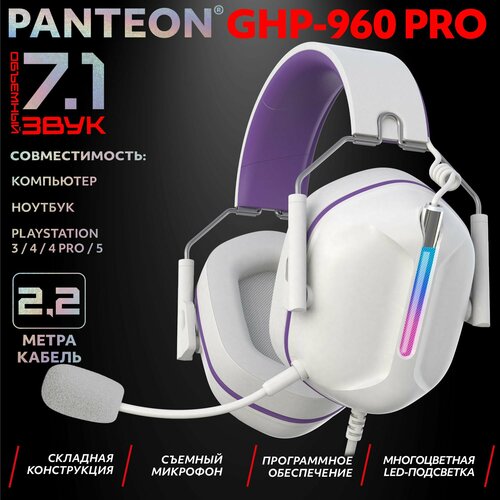 PANTEON GHP-960 PRO White-Purple Игровые наушники (USB-подключение, LED-подсветка, VIRTUAL SURROUND SOUND 7.1, складная конструкция, съемный микрофон, фирменное ПО), цвет: белый-фиолетовый
