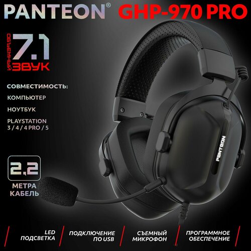 PANTEON GHP-970 PRO Black Игровые наушники (USB-подключение, LED-подсветка, VIRTUAL SURROUND SOUND 7.1, съемный микрофон, фирменное ПО), цвет: черный