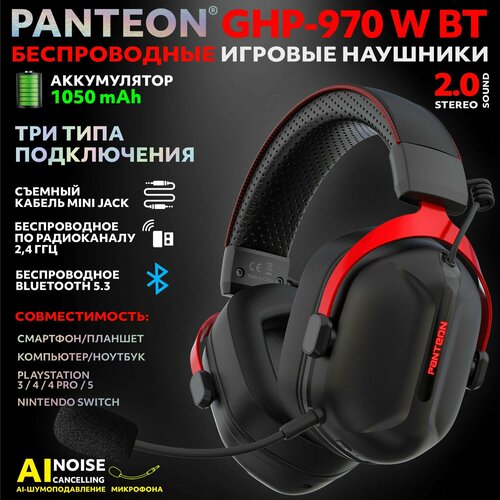 PANTEON GHP-970 W BT Black-Red Игровые наушники ( USB 2,4 ГГц (беспроводное) / BLUETOOTH 5.3 /MINI JACK 4 PIN, LED-подсветка, STEREO SOUND 2.0, съемный микрофон, аккумулятор 1050mAh)