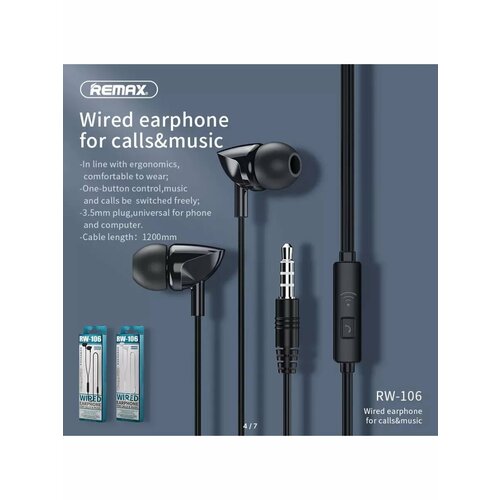 Наушники проводные Remax Rw-106 с шумоподавлением и регулятором громкости, 120 см, цвет черный