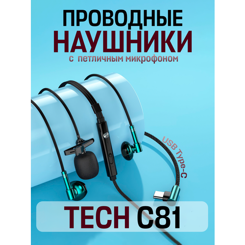 Наушники-вкладыши TECH C81, проводная гарнитура с микрофоном на петличке, type-c, изумрудный
