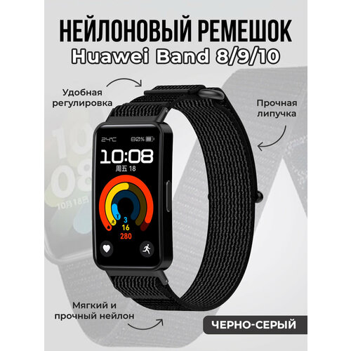 Нейлоновый ремешок для Huawei Band 8/9/10, на липучке, черно-серый