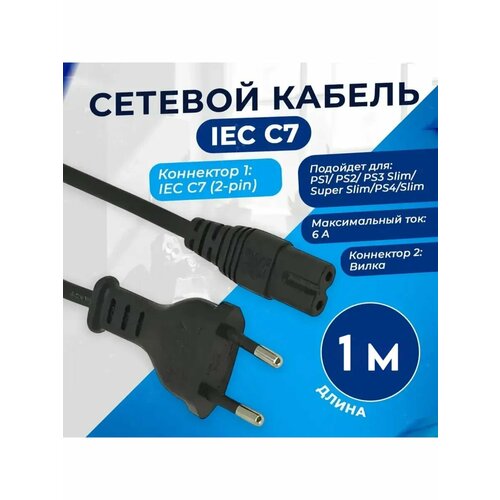 Сетевой кабель питания С7 для PS1/ PS2/ PS3 Slim/Super Slim/PS4/Slim, 1 метр