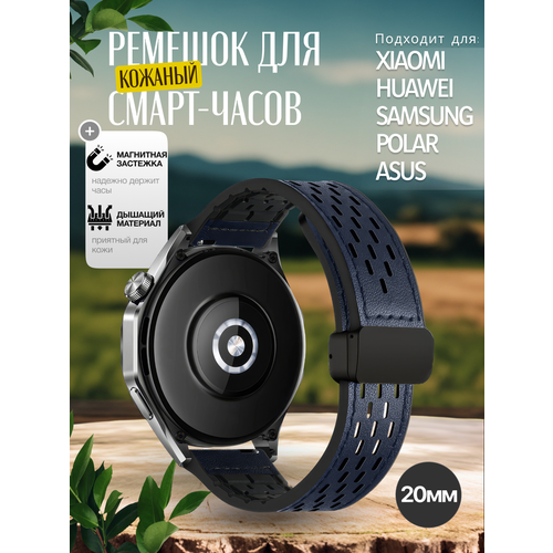 Кожаный ремешок 20мм для Huawei watch gt 4, Galaxy Watch, темно-синий