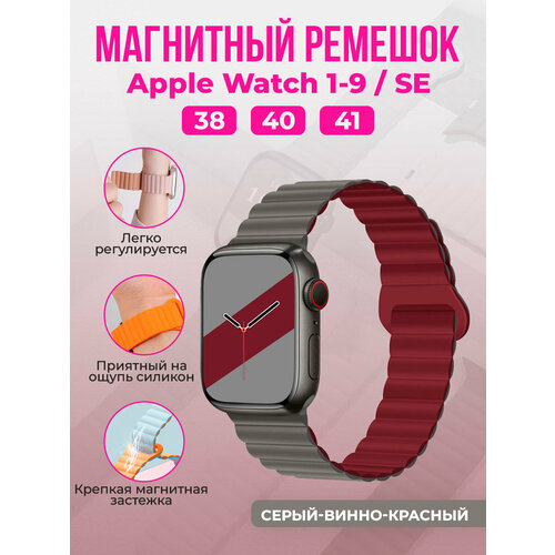 Магнитный силиконовый ремешок для Apple Watch 1-9 / SE (38/40/41 мм), серый-винно-красный