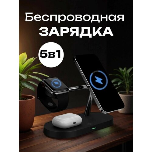 Беспроводная зарядка MagSafe для iPhone 5 в 1 / Беспроводная зарядка для iPhone, Apple Watch, Airpods / Черная
