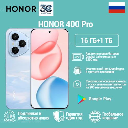 Смартфон HONOR 400 Pro, AMOLED 6,55 дюйма, камера 50 МП, зарядка 100 Вт, CN,16/1, Синий