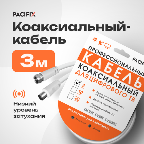 Кабель антенный RG6 Pacifix 3 м с разъемами F-F (TV-штекер и TV- гнездо)