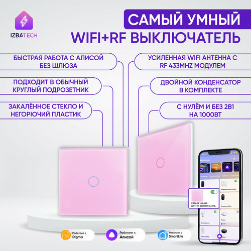 Умный сенсорный выключатель с Алисой WiFi и RF 433 розовый одноклавишный с двойным конденсатором и усиленной антенной