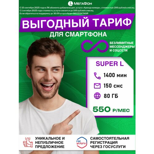 Сим-карта "МегаФон" "Super L", федеральная, для телефона/планшета, 1400 мин./мес, 80 ГБ/мес.