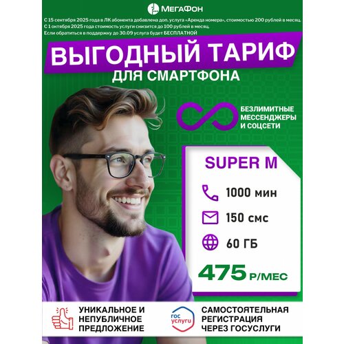 Сим-карта MegaFon Super M, безлимитная, 1000 мин/мес, 60 Гб, федеральная