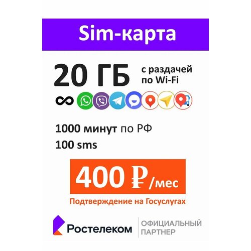 Симкарта Ростелеком "Безлимит 100гб (Теле2) 4G за 400 руб/месяц" для любых устройств