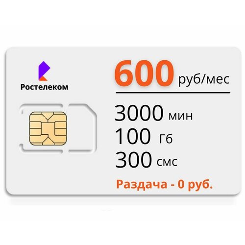 СИМ-карта Ростелеком, на сети Теле2. 3000 мин по РФ , 100 Гб, 300 смс, за 600 руб/мес. Тариф для интернета. Смартфон и модем.