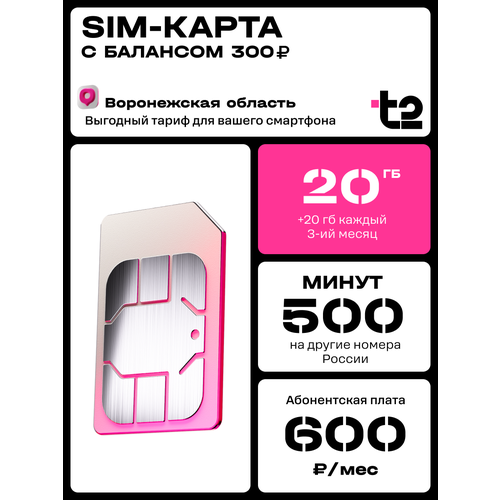 Sim-карта t2 для Воронежской области, баланс 300 рублей