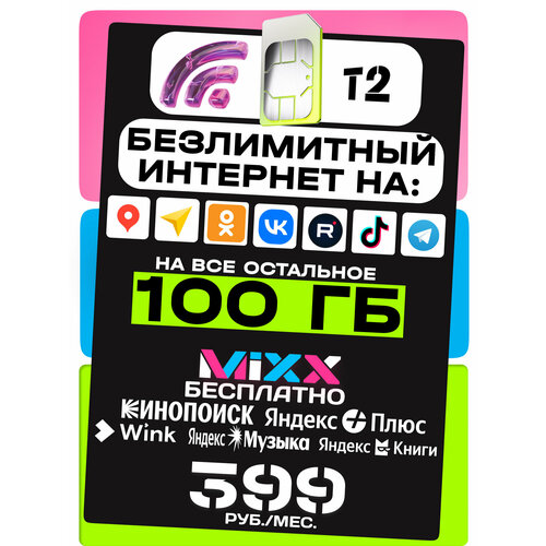 SIM-карта t2 100 ГБ + бесплатно подписка Яндекс Плюс, Музыка, Книги, Кинопоиск, Wink и многое другое Тариф Классический Микс S