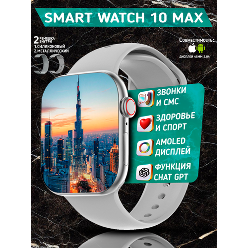 Умные часы WATCH 10 Max, Смарт часы watch 10 Max, premium smart watch, 46 мм с NFC, 2 ремешка, Серебристый