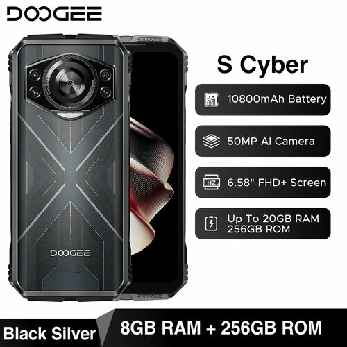 Мировая премьера DOOGEE S Cyber Прочный телефон 6,58 дюйма 90 Гц IPS-экран 10800 мАч Большая батарея 8 ГБ + 256 ГБ 50 МП AI Основная камера Android 14, Black Silver, Global Version