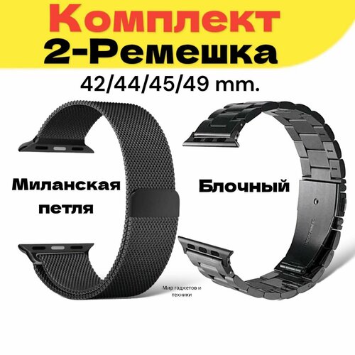 Комплект,2РЕМЕШКА/Металлический блочный стальной ремешок/ миланская петля для смарт часов Apple Watch Series 1-9 , SE , Ultra и Ultra 2 ; 42mm / 44mm / 45mm / 49mm ( Браслет для Эпл Вотч 1-9) Черный