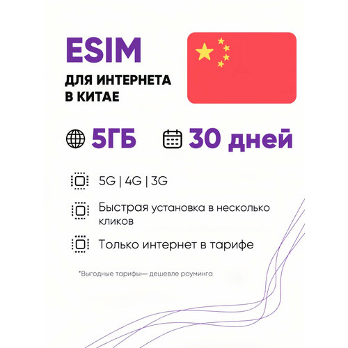 ESIM для интернета в Китае 5 ГБ на 30 дней. Виртуальная сим-карта для Китая